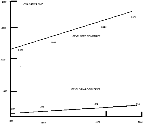 If we study tables 1 and 5, we see that there are two measures of the gap between the developed and developing countries. Apparently, the gap of per capita income between developing countries and developed countries is not lessening; as a matter of fact, it is widening, from the ratio of 1:12 to 1:13. In 1974, per capita income of the developed countries taken together is US$4,000. In developing countries, it is US$ 315.00, which is not far different from US$ 207.00 in 1960.