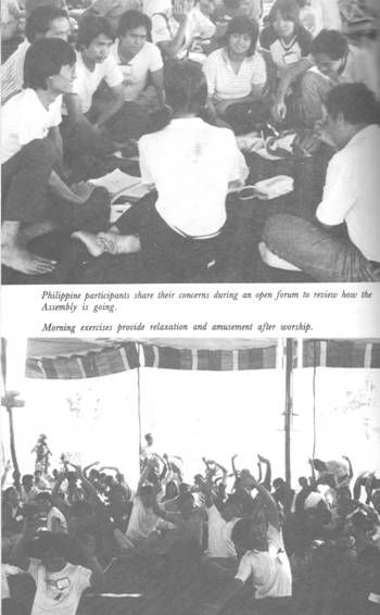 Sakamoto Teruki, a fisherman from Minamata, Japan, attended the Assembly as a witness. Through an interpreter he shared his story. Many people on the shores of Minamata Bay have been grievously affected by the long term pollution of the water by mercury effluent from the Chisso Company factory. Originally thought to be a disease rather than slow poisoning, Minamata disease has caused great suffering. CCA YOUTH began sending ecumenical youth to visit Minamata victims in 1982. Mr. Sakamoto repaid these visits by attending the AYA and informing many more Asian youth about the victims of the Japanese economic system.